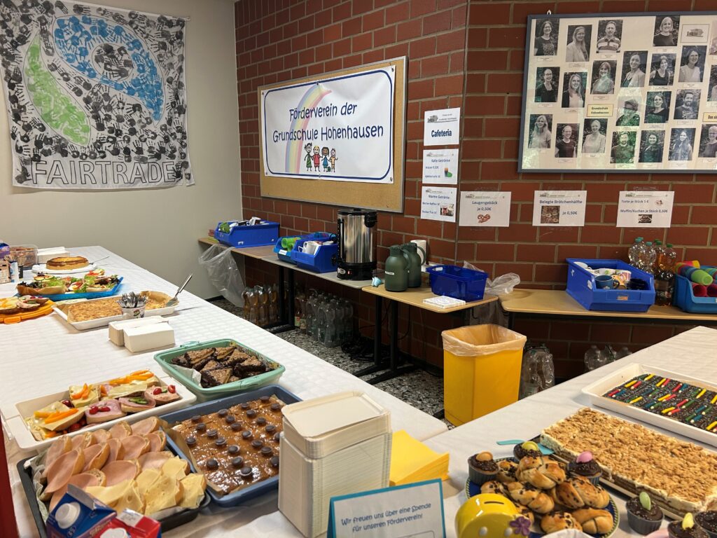 In der von Eltern betreuten Cafeteria konnten sich die Besucherinnen und Besucher an einer Vielzahl leckerer herzhafter und süßer Gebäcke stärken, während auf der Terrasse hausgemachte Fairtrade-Smoothies und unsere fairen Schul-T-Shirts angeboten wurden. Daneben warteten viele spannende Aktivitäten in den Klassenräumen; Es gab den sehr beliebten Schnupperunterricht für die zukünftigen Erstklässlerinnen und Erstklässler sowie viele MINT-Angebote rund um das forschende Lernen. So konnten bunte Murmelbahnen gebaut, sowie spannende Farb- und Luftexperimente durchgeführt werden. Im 4. Schuljahr wurde Sahne in Butter „verwandelt“. Natürlich durften ein englisches sowie ein Bewegungsangebot auf dem Schulhof nicht fehlen. Auch der Acker war wieder sehr beliebt.