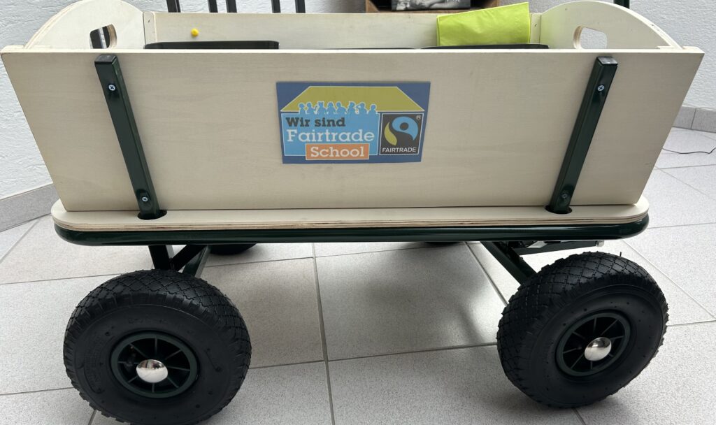 Verkauft wird aus unserem Fairtrade-Bollerwagen, der auch auf dem Foto gut zu erkennen ist. Besonders die fairen Schokoriegel waren diesmal ein echter Renner!